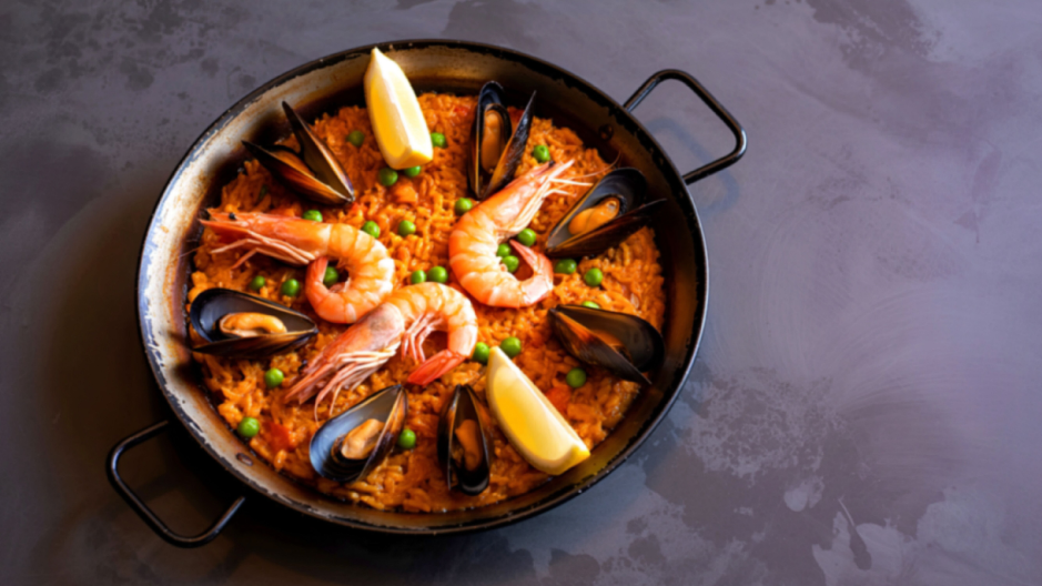 Mit Sepia, Hähnchen, Garnelen, Venus- und Miesmuschelfleisch, bunte Paprikastreifen, Zwiebeln, Knoblauch, feine Erbsen, knackige Prinzessbohnen, Tomaten, original Bomba-Reis und echtem Safran.